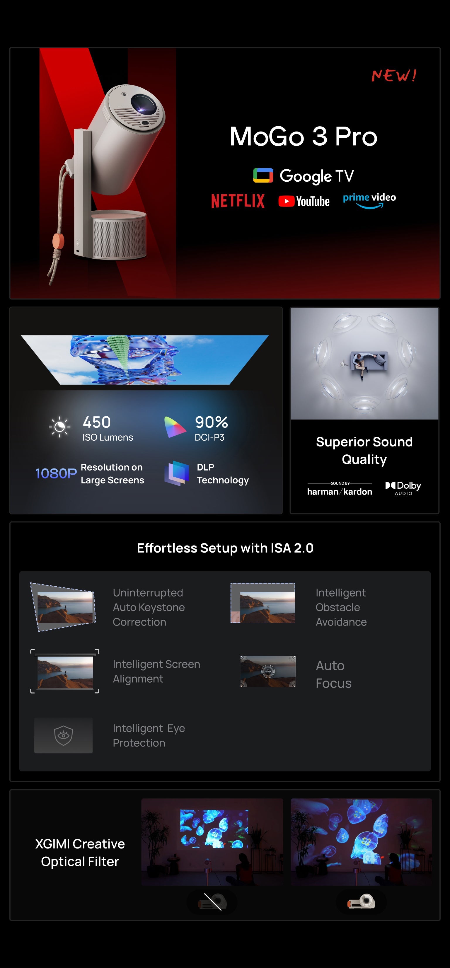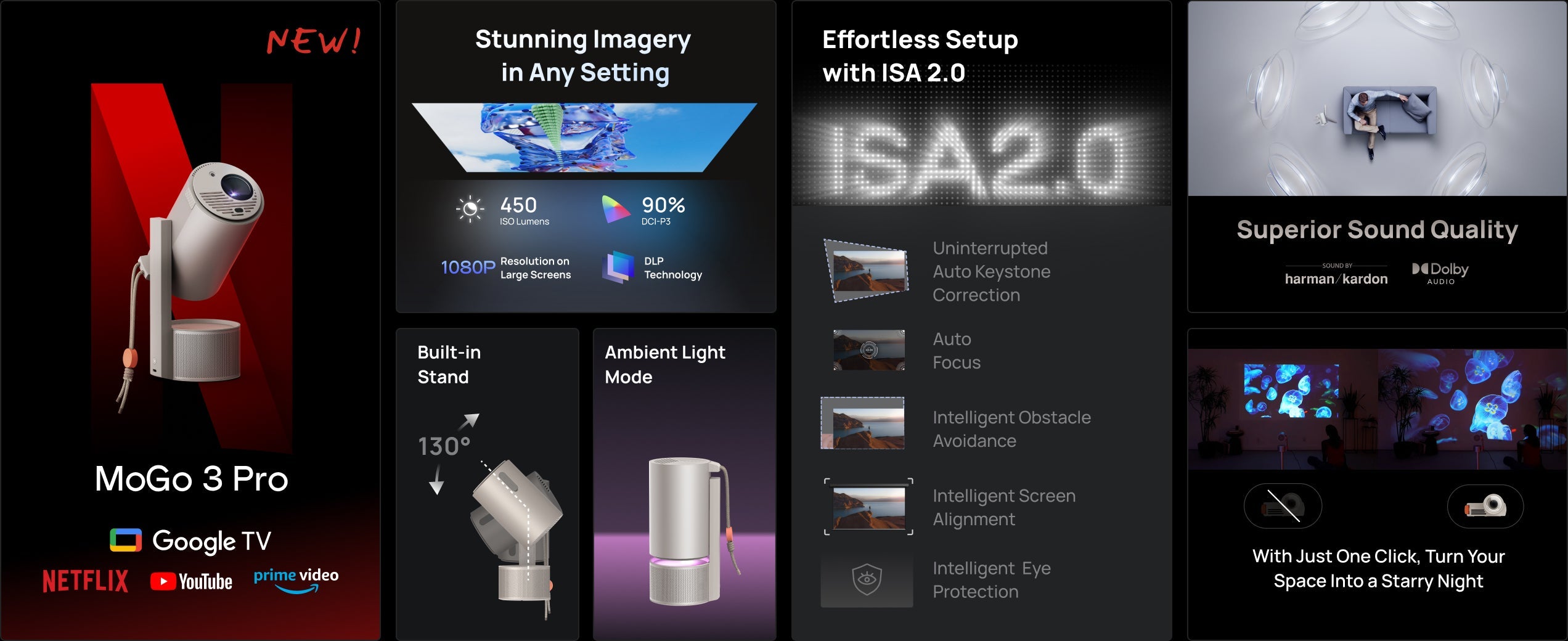 - 130° Adjustable Stand & ISA 2.0 for Perfect Alignment: With a 130° adjustable stand and ISA 2.0, MoGo 3 Pro ensures an automatically adjusted, perfectly aligned image from any angle. Enjoy stable, uninterrupted viewing with the metal slide rail, and keep the lens protected with its smart design.