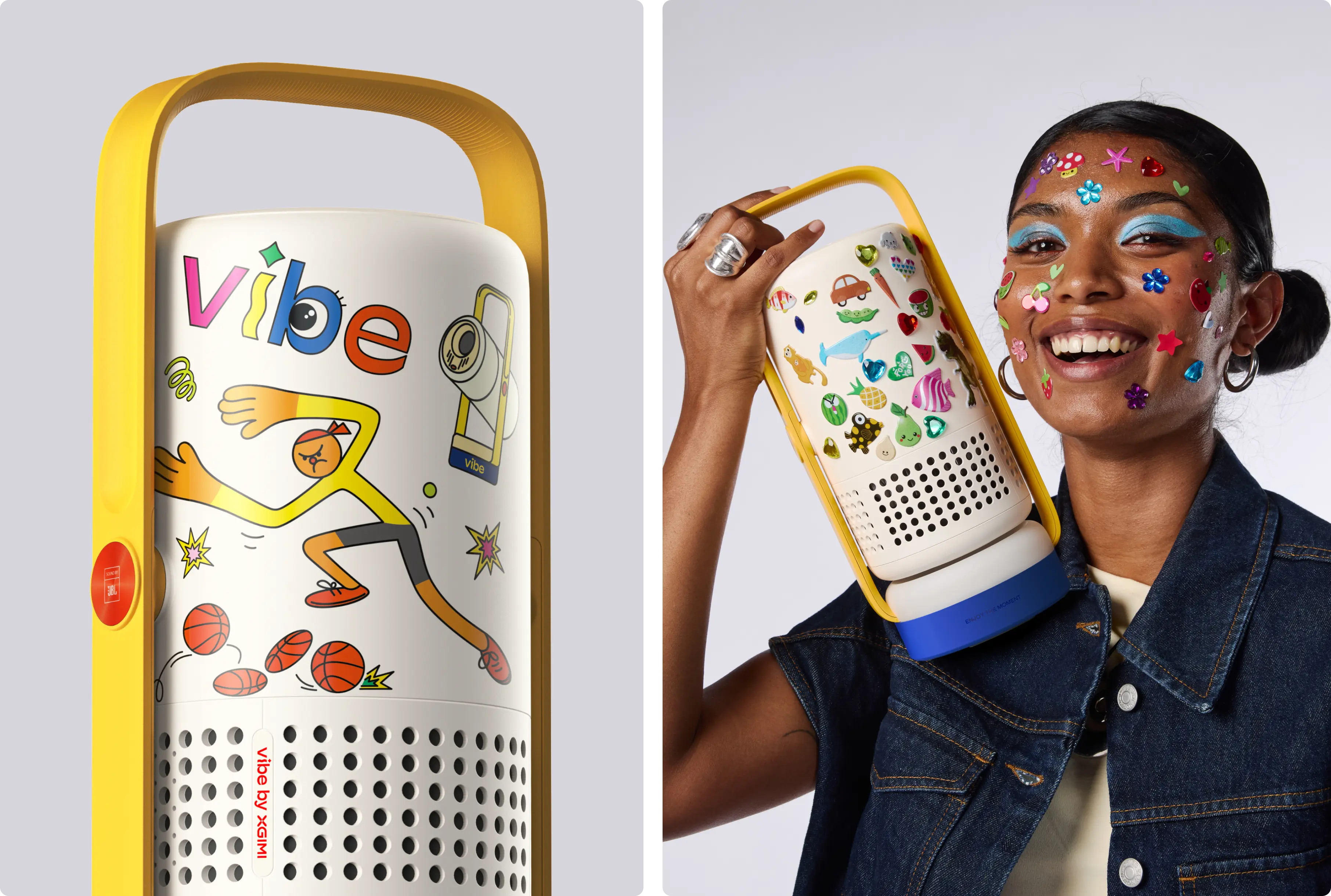 - Stylish, Eye-Catching Design: The modern design of Vibe One (Battery Powered) adds personality and style to any space. Pick the color that fits your style — classic, timeless grey or a retro, playful blue-yellow color combo. And with the in-box stickers, you can customize it your way.