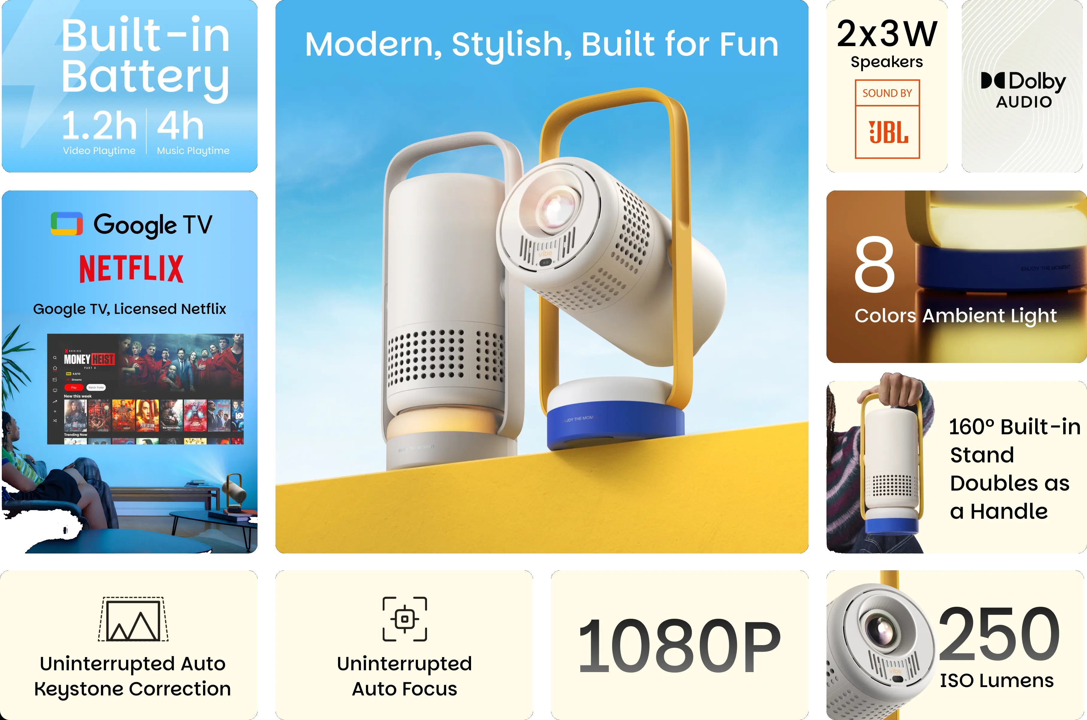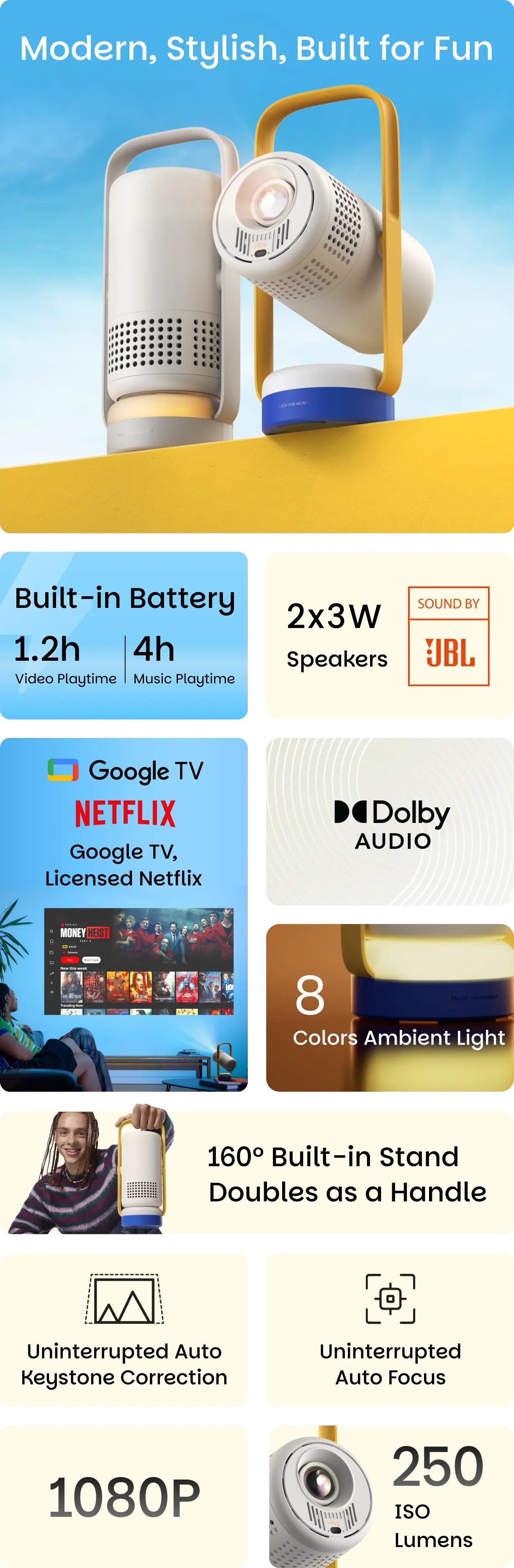 - All-in-One Vibe Creator: More than just a smart portable projector — dual 3W speakers, tuned with Sound by JBL, powerfully play your favorite tunes, while Ambient Light Mode sets the perfect mood.