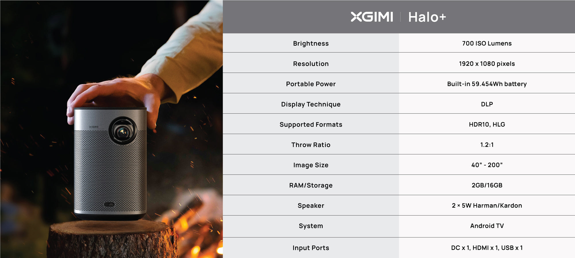 The ultra-portable Halo+ features superior engineering, a built-in 59Wh battery, and minimalist design all in one, providing you spectacular big-screen entertainment on the go. With 2.5 hours of playtime, your next camping trip will be nothing short of extraordinary.