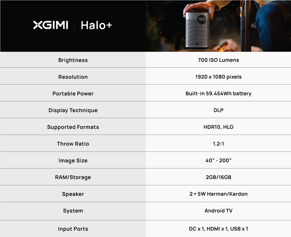 - Fully Portable Design: Halo+’s built-in 59.454Wh battery provides you 2.5hrs of spectacular big-screen entertainment on the go.